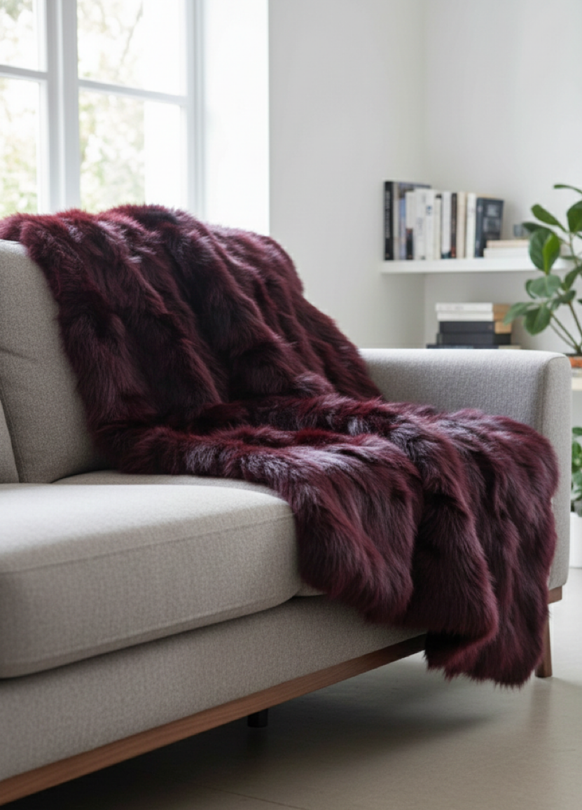Drape yourself in luxury with this stunning sectioned fox fur blanket, featuring rich wine tones that elevate any room's aesthetic. The plush red velvet backing delivers an irresistibly soft feel against your skin, making it as comfortable as it is visually striking. Transform your space into a sanctuary of sophistication and warmth with this timeless piece that commands attention and invites indulgence.