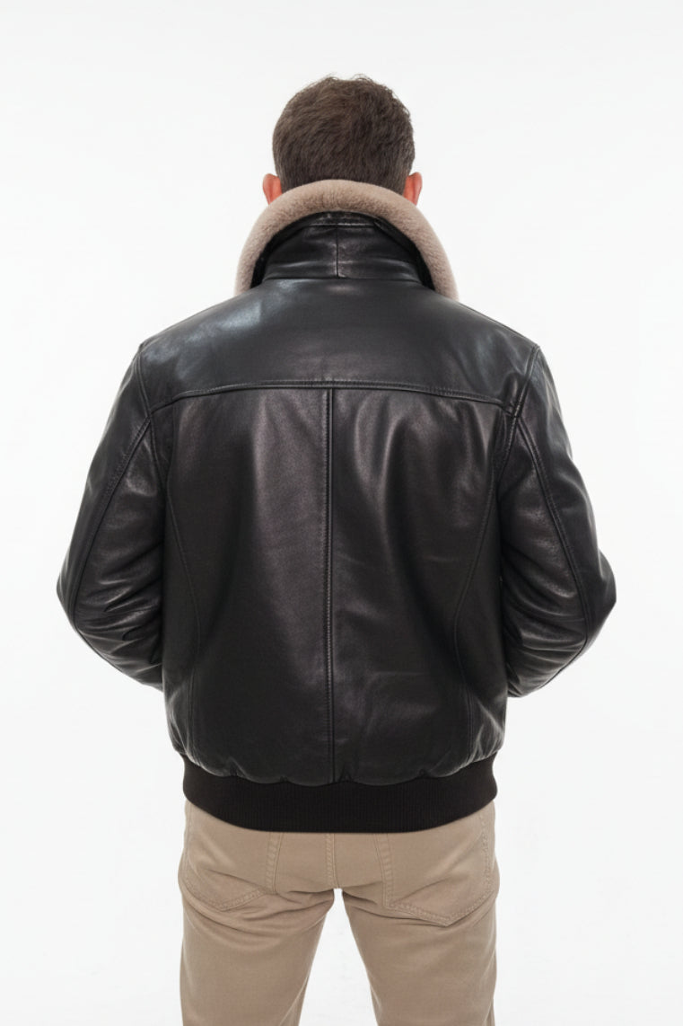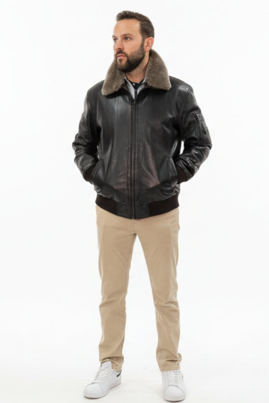 Elevate your wardrobe with this timeless leather bomber jacket, designed for the modern man who values both style and versatility. The luxurious brown leather bomber features a gray shearling collar that is detachable, allowing you to transition seamlessly from casual to refined looks. A smooth zip front, multiple pockets, and complete lining ensure comfort and practicality for everyday wear. Whether you're dressing up or down, this jacket delivers effortless sophistication and lasting quality.