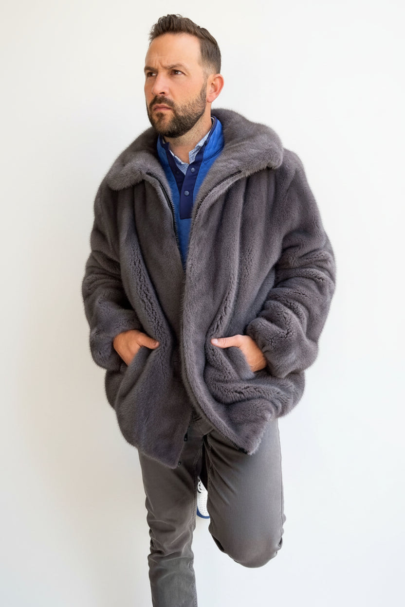 A mink fur jacket for men with style. The long lasting durability, warmth and style that is mink is finally available for men, all at an affordable price! This zip front men's bomber jacket is finely crafted from high quality female mink. The wing collar adds another element of rugged warmth that will enhance those dull winter days. A wonderful gift idea for the man in your life! Features side pockets, a zip front, and elastic at the waist and sleeve. We can also have our master furriers add a detachable hood.