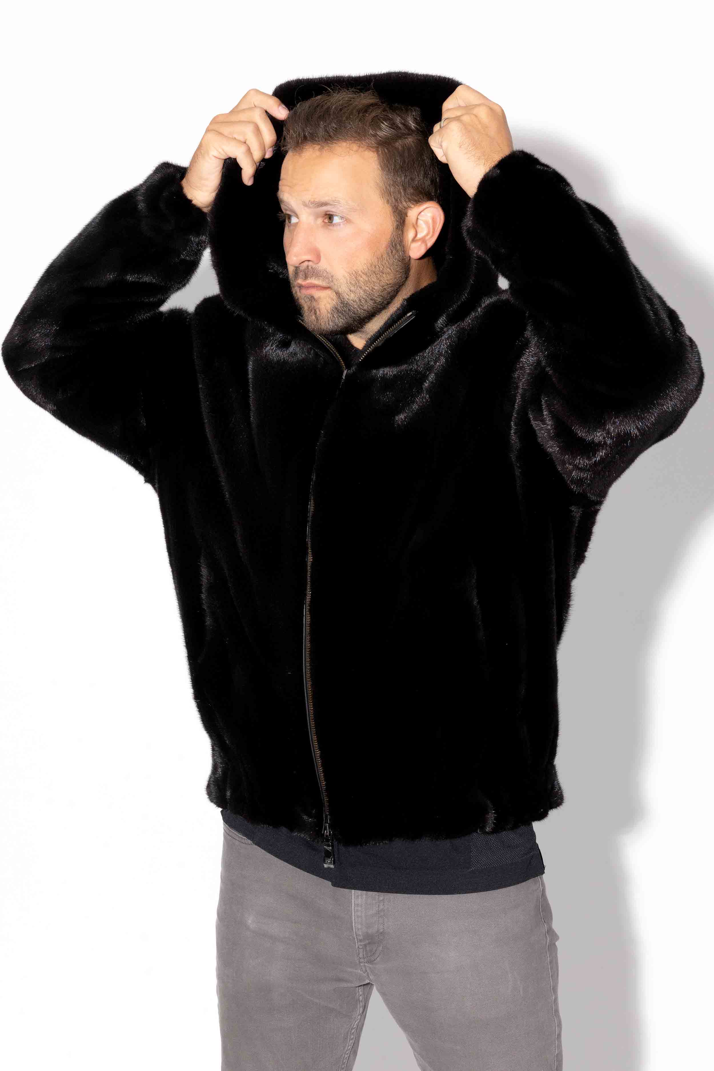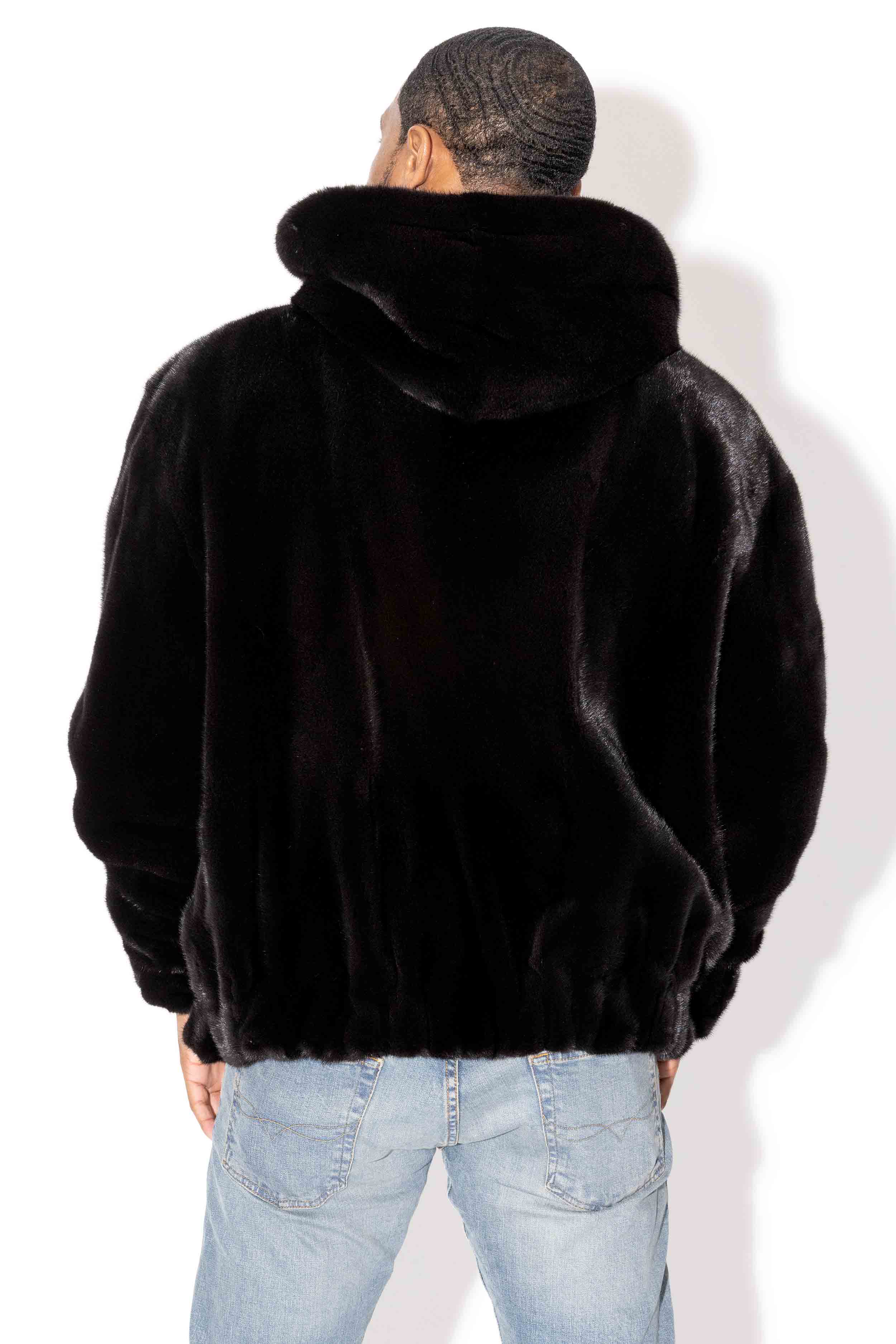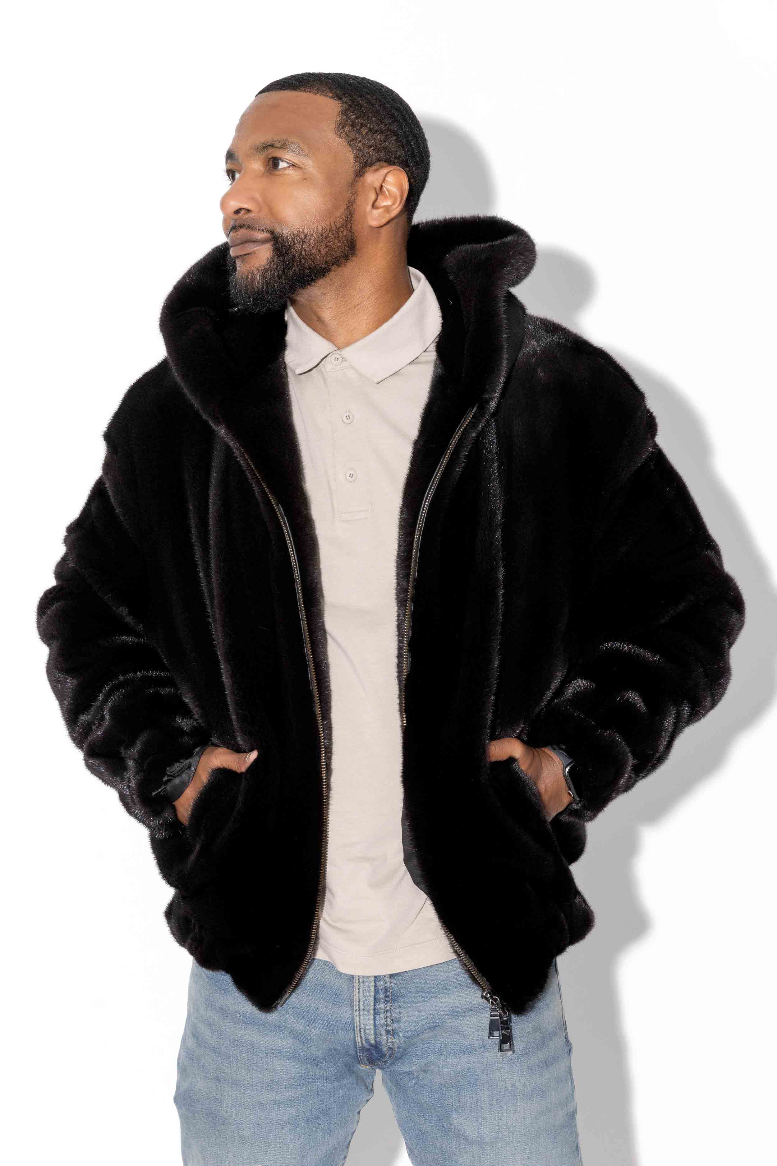 This distinctive men's ranch mink fur bomber jacket includes a hood and zip front. With a fully lined interior, side pockets, and elastic cuffs and waistband, it delivers exceptional comfort and style that stands apart.