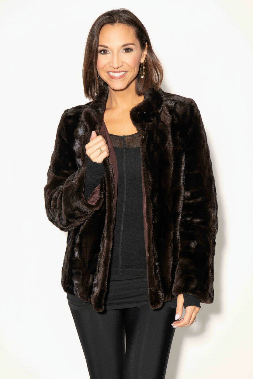 This stylish sheared sectioned mink fur jacket showcases a standup collar with magnetic closure, and convenient side pockets. Designed with all-weather lining and secure snap closures, it combines elegance with everyday functionality. This jacket is the perfect addition to any wardrobe!
