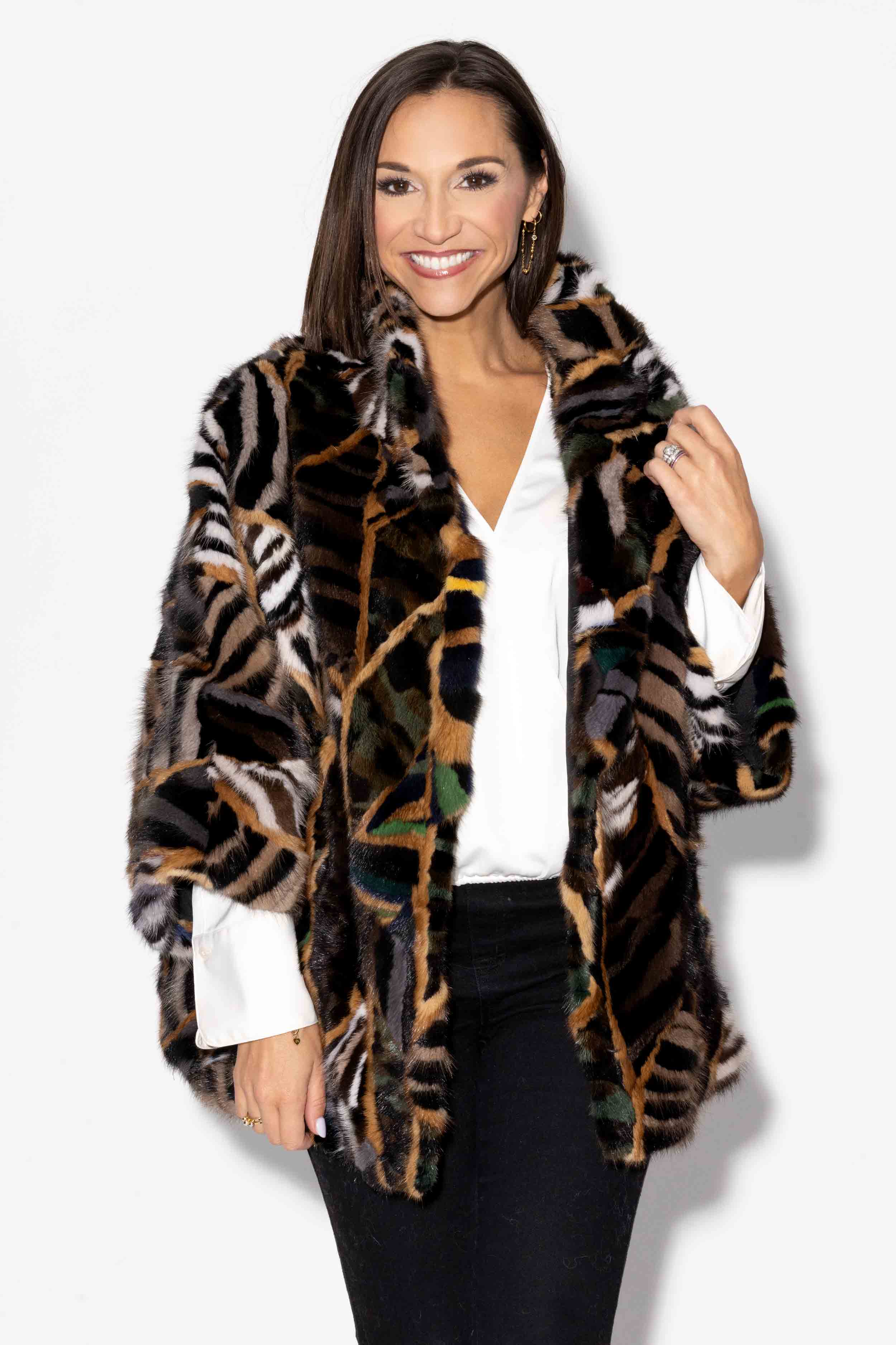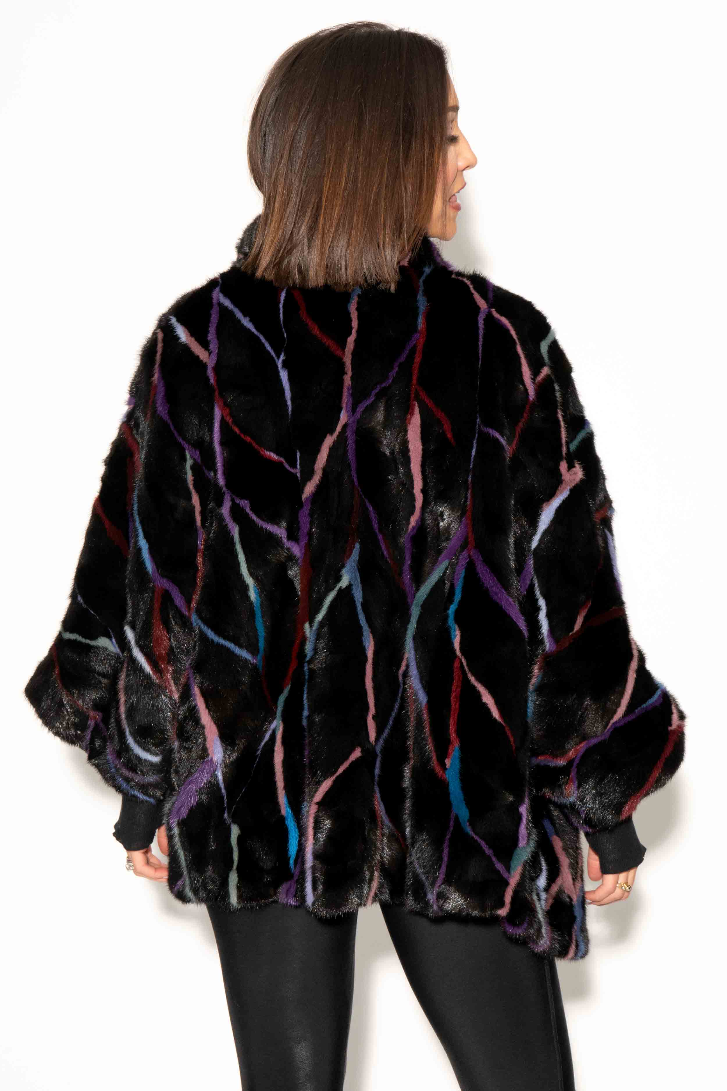 This stunning sectioned mink fur cape showcases a stand-up collar that transforms into a wing collar when opened. It features hook & eye snap closures. This cape includes stylish cropped sleeves, is fully lined for comfort, and offers convenient side pockets. One size fits most.