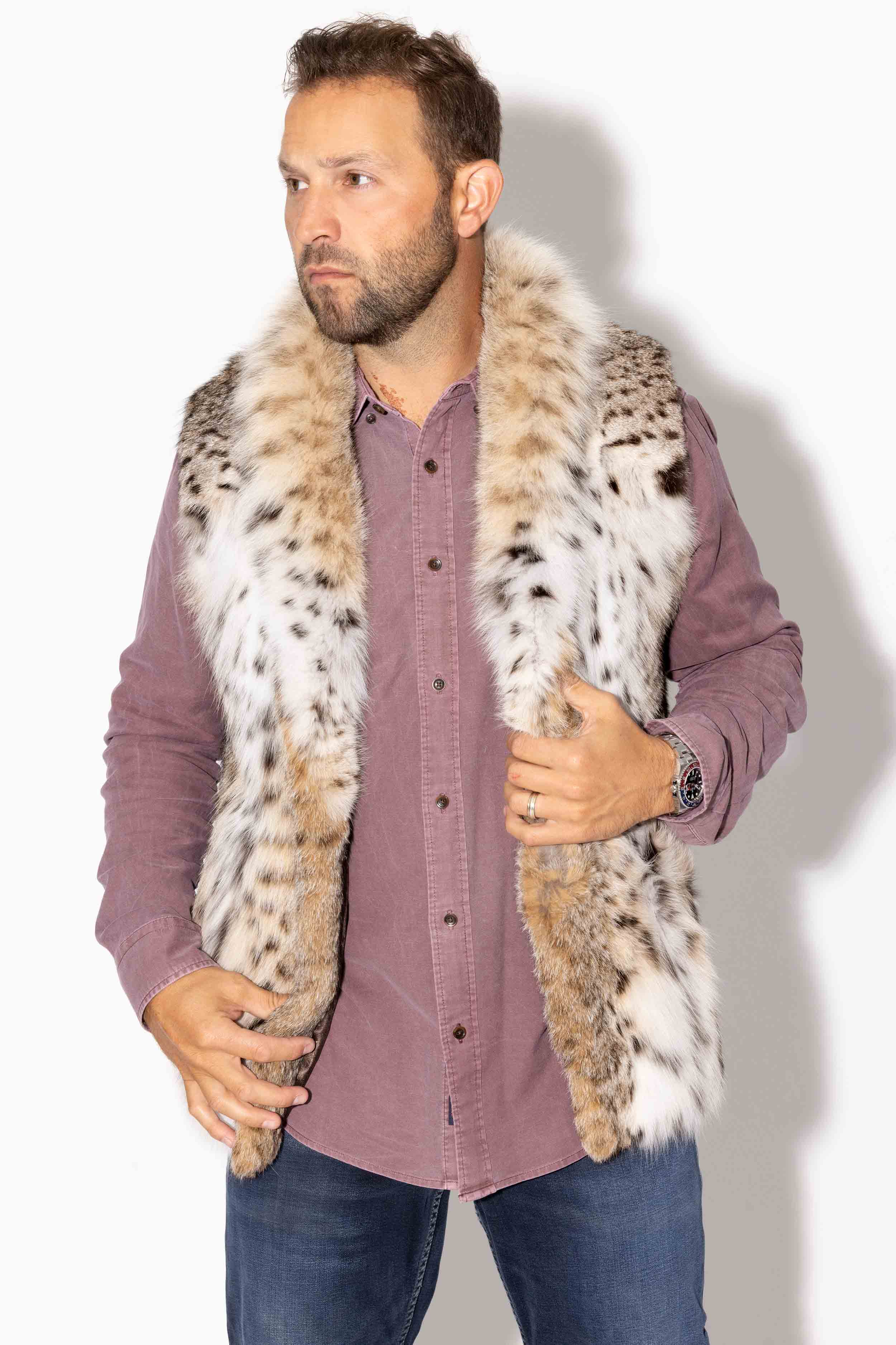 This timeless men's natural bobcat fur vest showcases a distinctive shawl collar. Fully lined for comfort, it includes convenient side pockets and secure hook & eye snap fastenings. Combining elegance with durability, this vest is the perfect blend of style and strength.