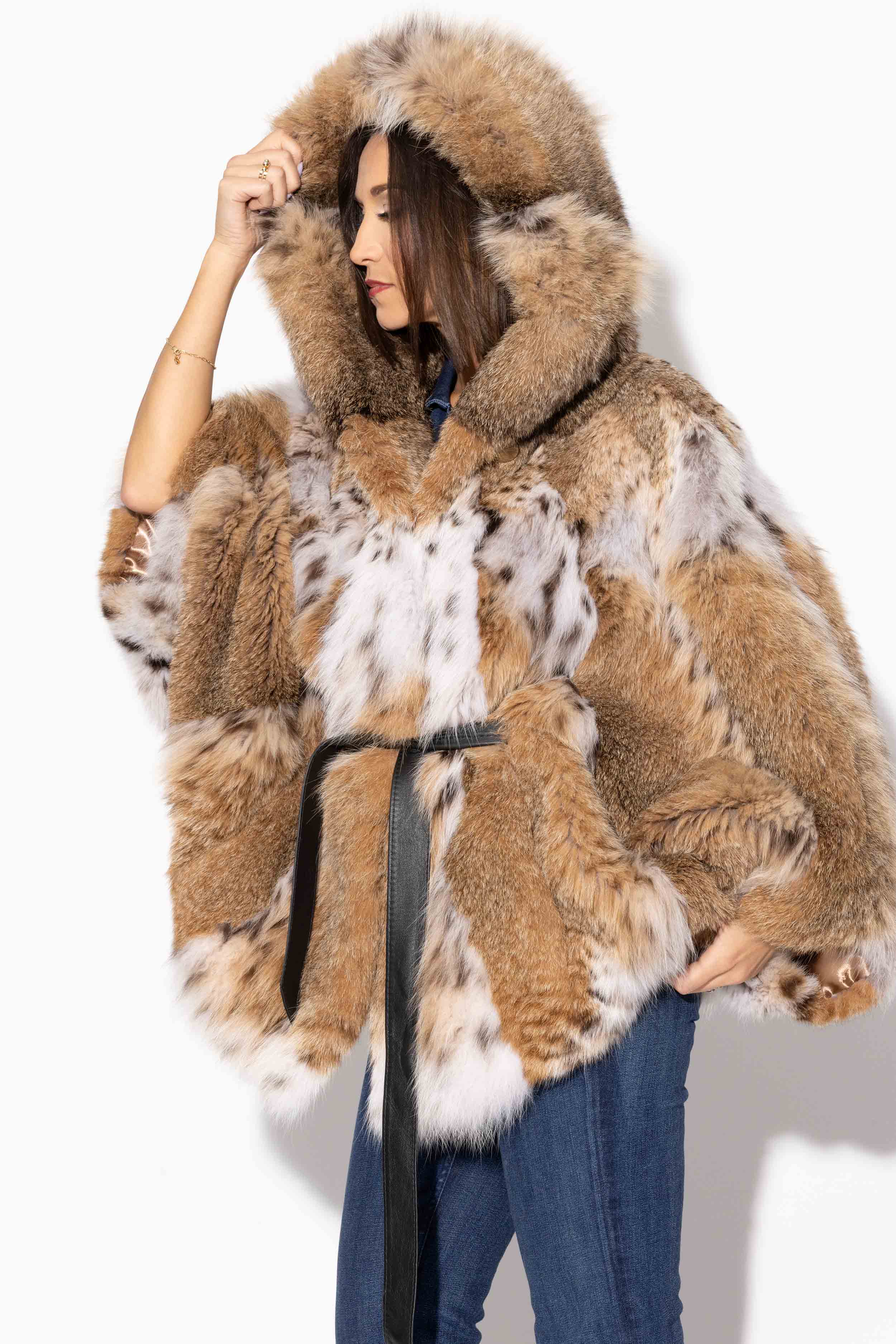 This beautiful bobcat fur cape features a full fur hood and side pockets. It is fully lined with a silk/polyester blend lining, and has a detachable leather belt to cinch the waist for a more flattering fit. It also has hook & eye closures in the front. One size fits most (XS-XL).