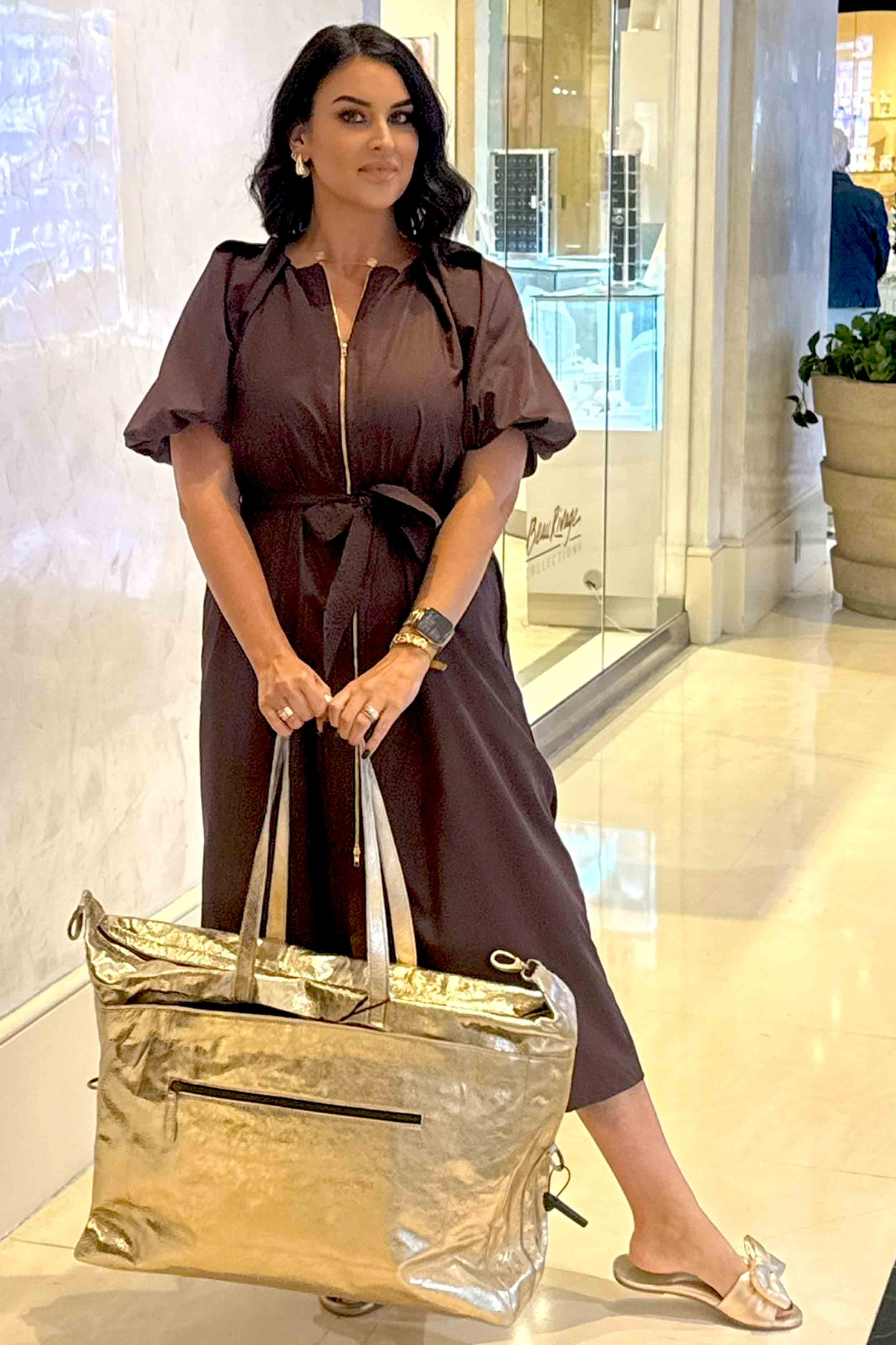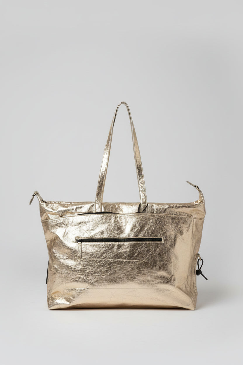 Handcrafted from genuine leather, this foil leather weekender bag combines style with practical features. It offers two strong leather handles, a main compartment secured by a zipper, and two roomy zippered side compartments. A convenient exterior zip pocket houses a trolley sleeve to easily attach the bag to rolling luggage. Additional highlights include a detachable, adjustable leather shoulder strap, a large leather trimmed interior pouch with velcro closure, two inner pouch pockets, a spacious inside zippered pocket, and metal feet for enhanced protection and balance. Discover a tote designed to fulfill all your carrying needs with effortless elegance.