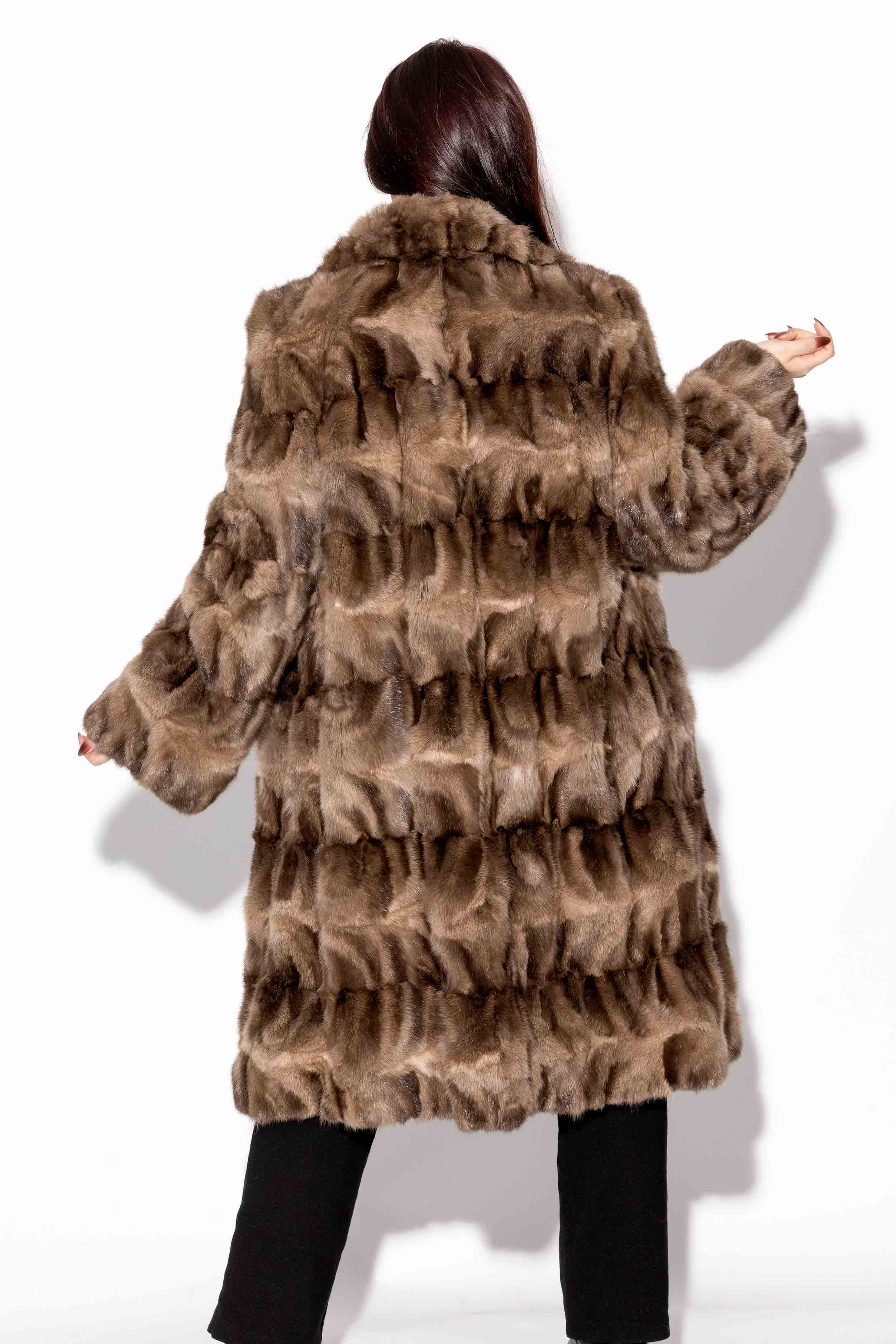 This stunning 7/8 length coat made of Russian sable fur showcases an elegant wing collar. Fully lined for comfort and equipped with convenient side pockets, it closes securely with hook and eye snaps. Add this luxurious piece to your wardrobe for timeless style and warmth.