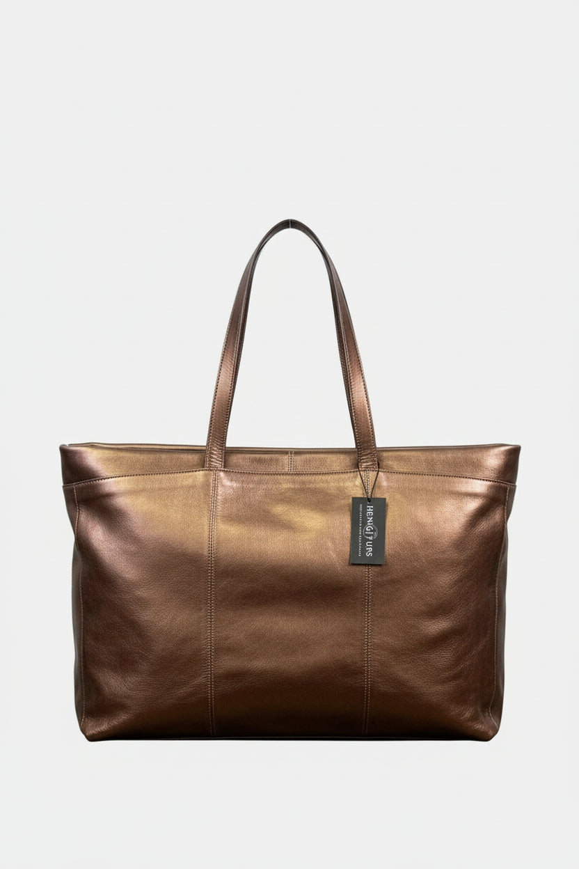 Handcrafted from genuine leather, this foil leather large tote bag combines style with practical features. It offers two strong leather handles, a main compartment secured by a zipper, and two roomy zippered side compartments. A convenient exterior zip pocket houses a trolley sleeve to easily attach the bag to rolling luggage. Additional highlights include a detachable, adjustable leather shoulder strap, a large leather trimmed interior pouch with velcro closure, two inner pouch pockets, a spacious inside zippered pocket, and metal feet for enhanced protection and balance. Discover a tote designed to fulfill all your carrying needs with effortless elegance.