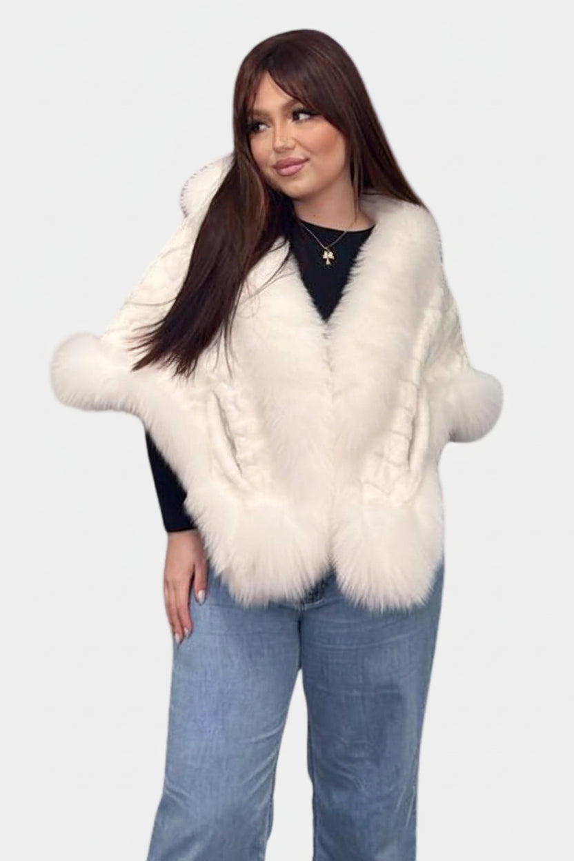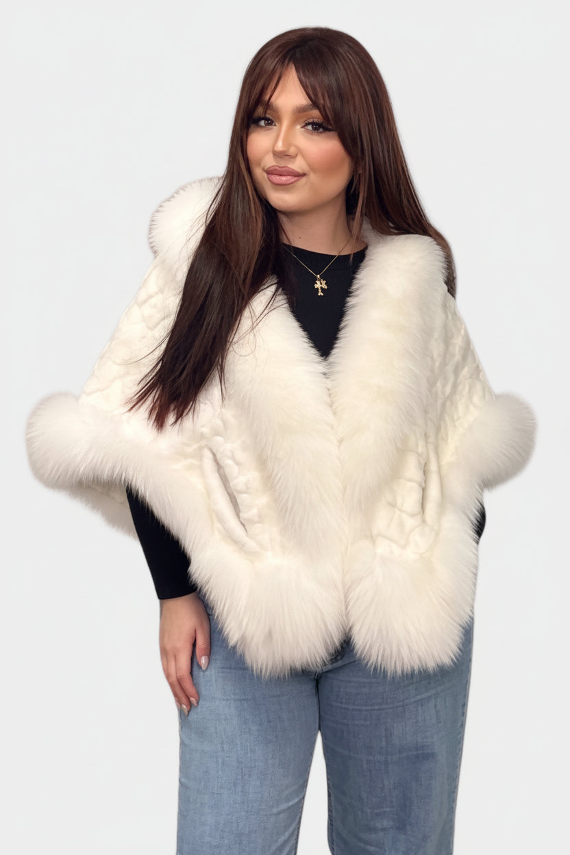 White Chevron Sectioned Mink Fur Cape with Fox Fur Trim