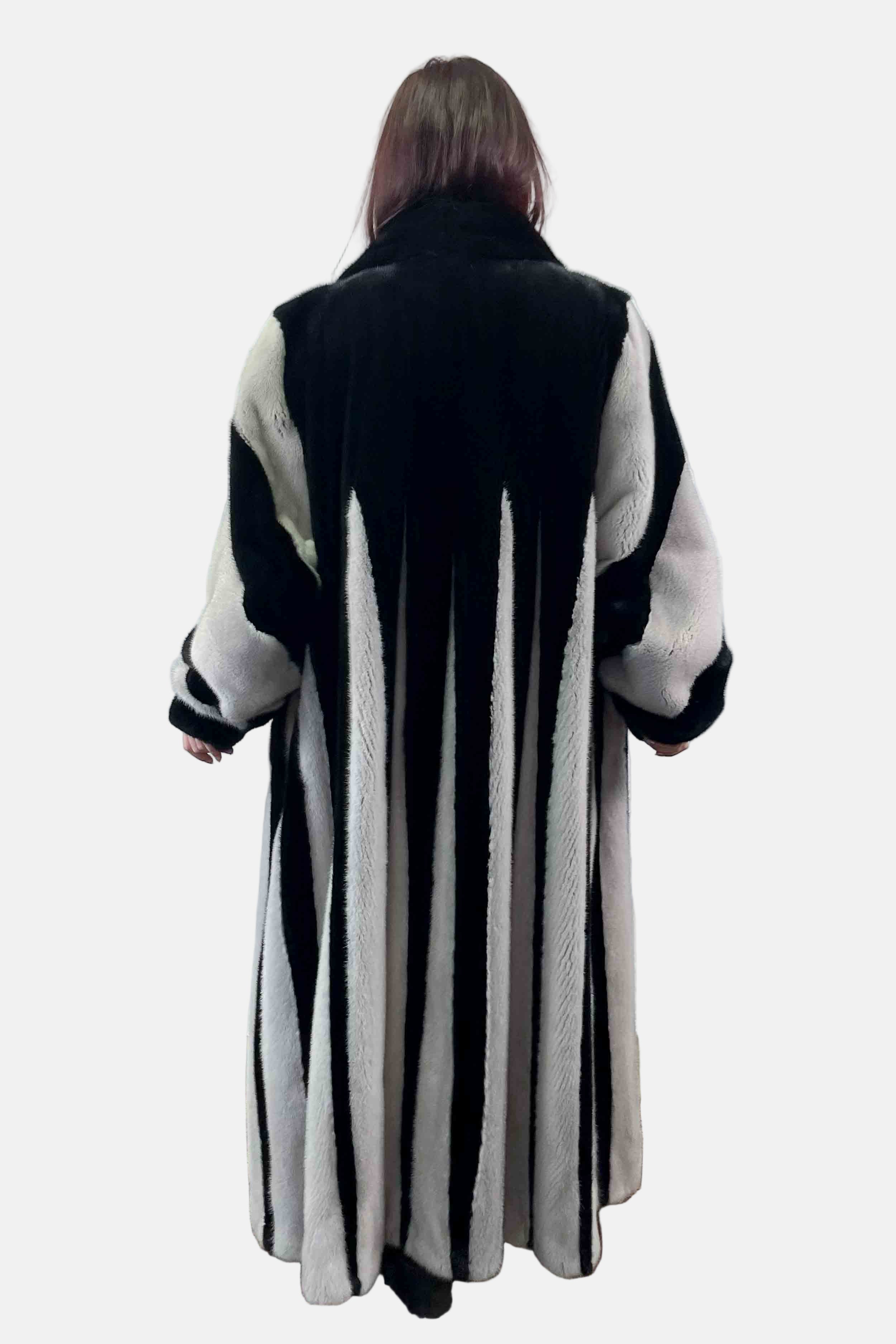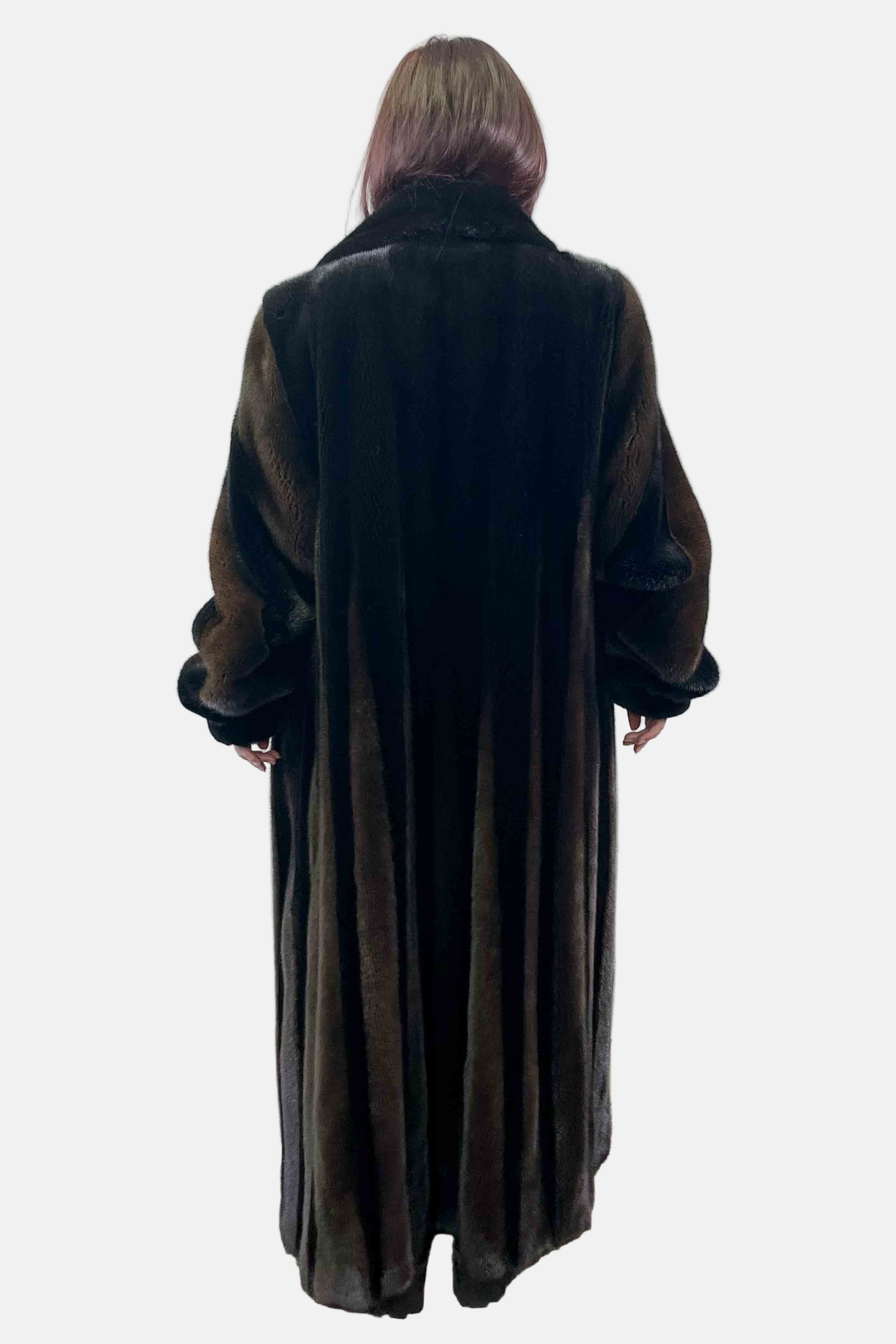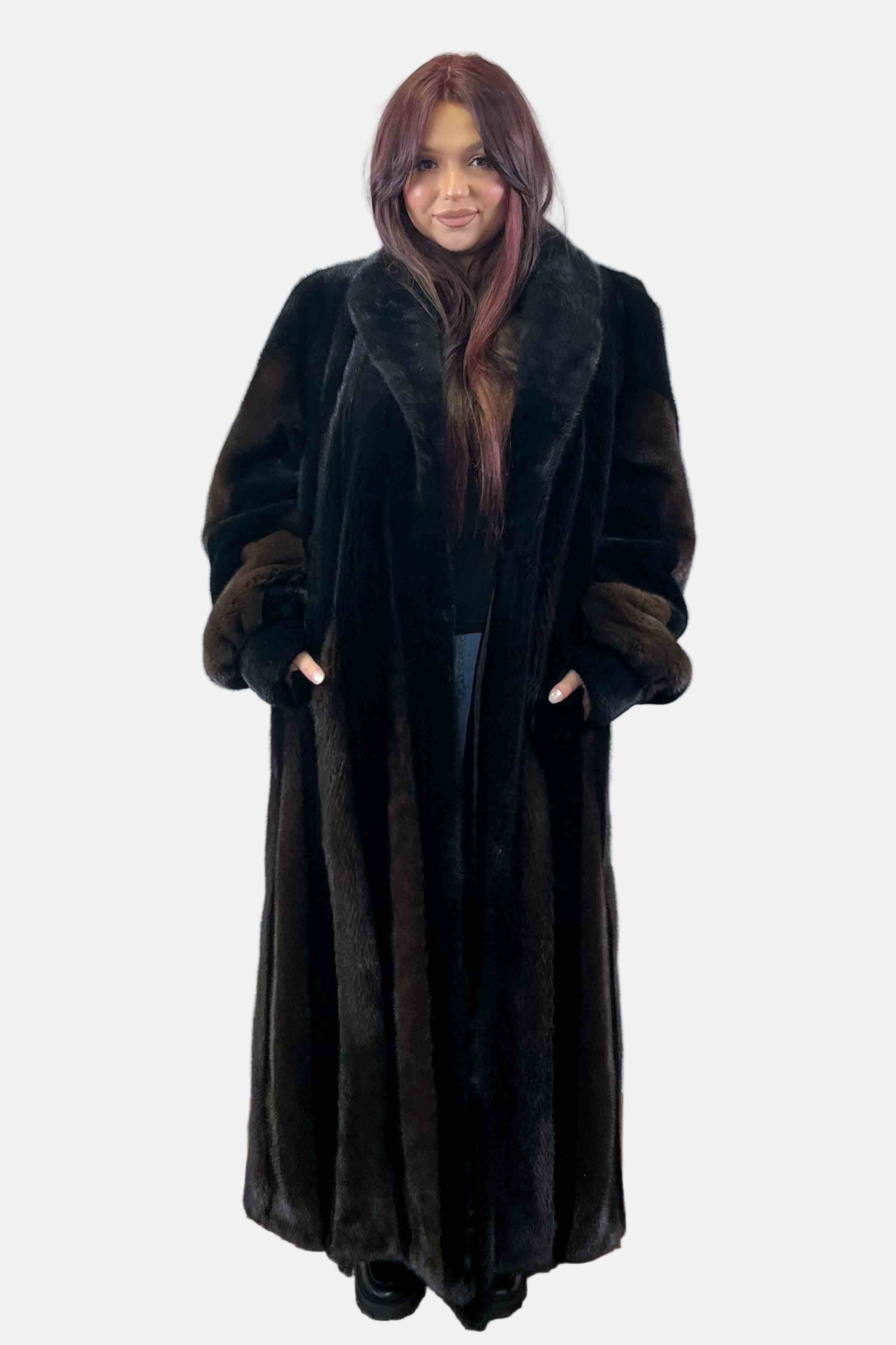 Look and feel elegant in this NAFA OR SAGA SELECT,VERY FINEST Fur, two-toned mink coat. With it's traditional shawl collar and bracelet cuffs, you'll be ready for a wonderful night out on the town! This coat features hook & eye snap closures, side pockets, and is fully lined.
