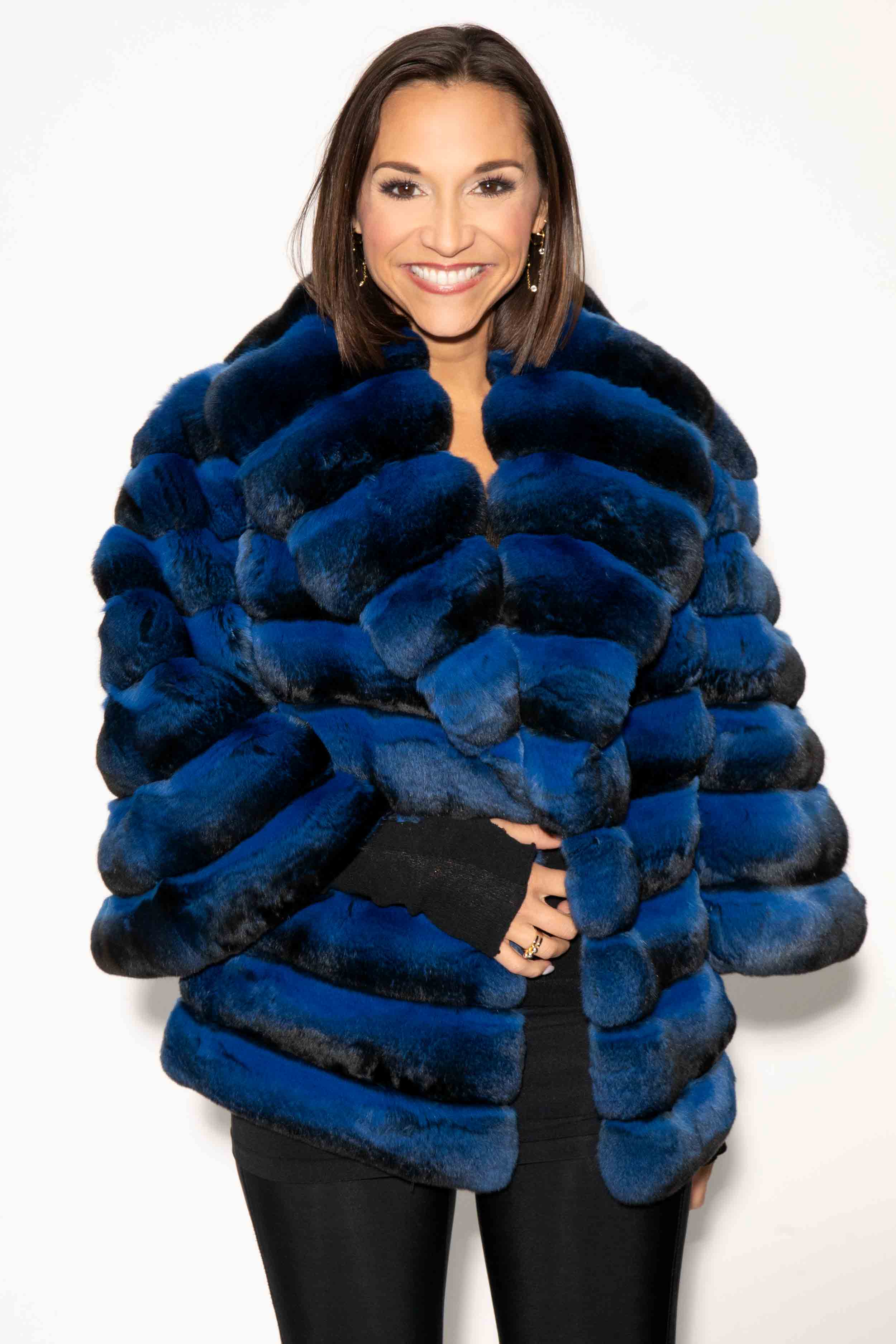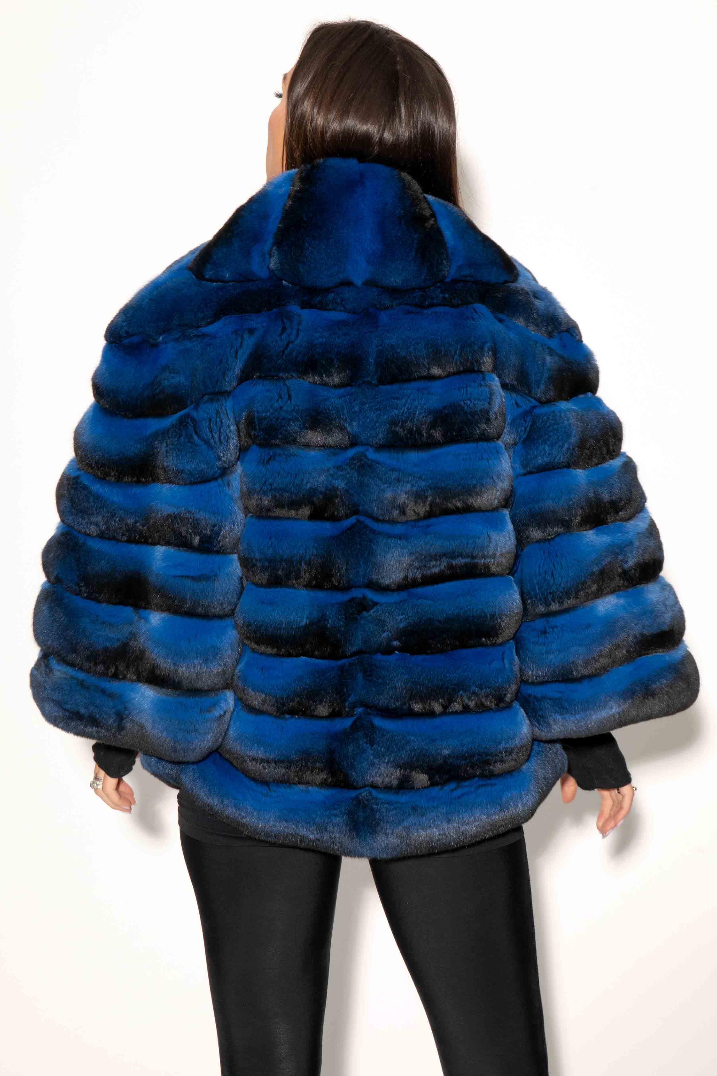 This stunning blue chinchilla fur bolero jacket showcases a shawl collar and elegant cropped bell sleeves. Fully lined and equipped with hook and eye closures plus side pockets, it combines luxury with practicality. Secure this exclusive fur piece for your collection before this rare style disappears!