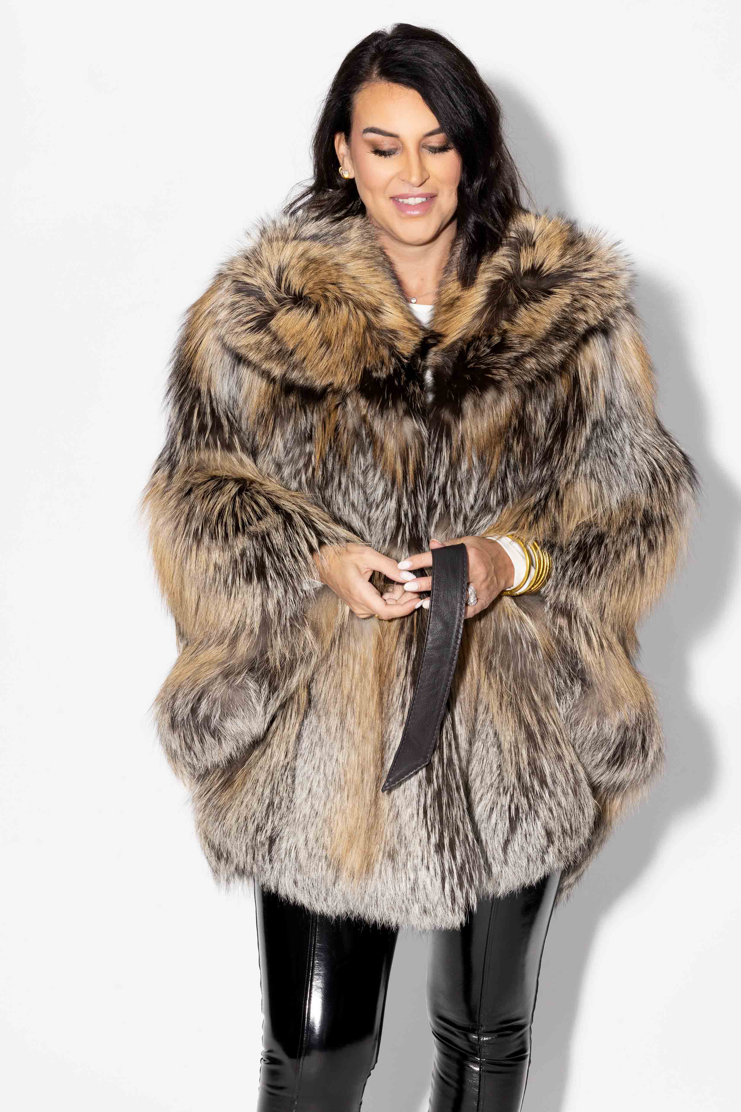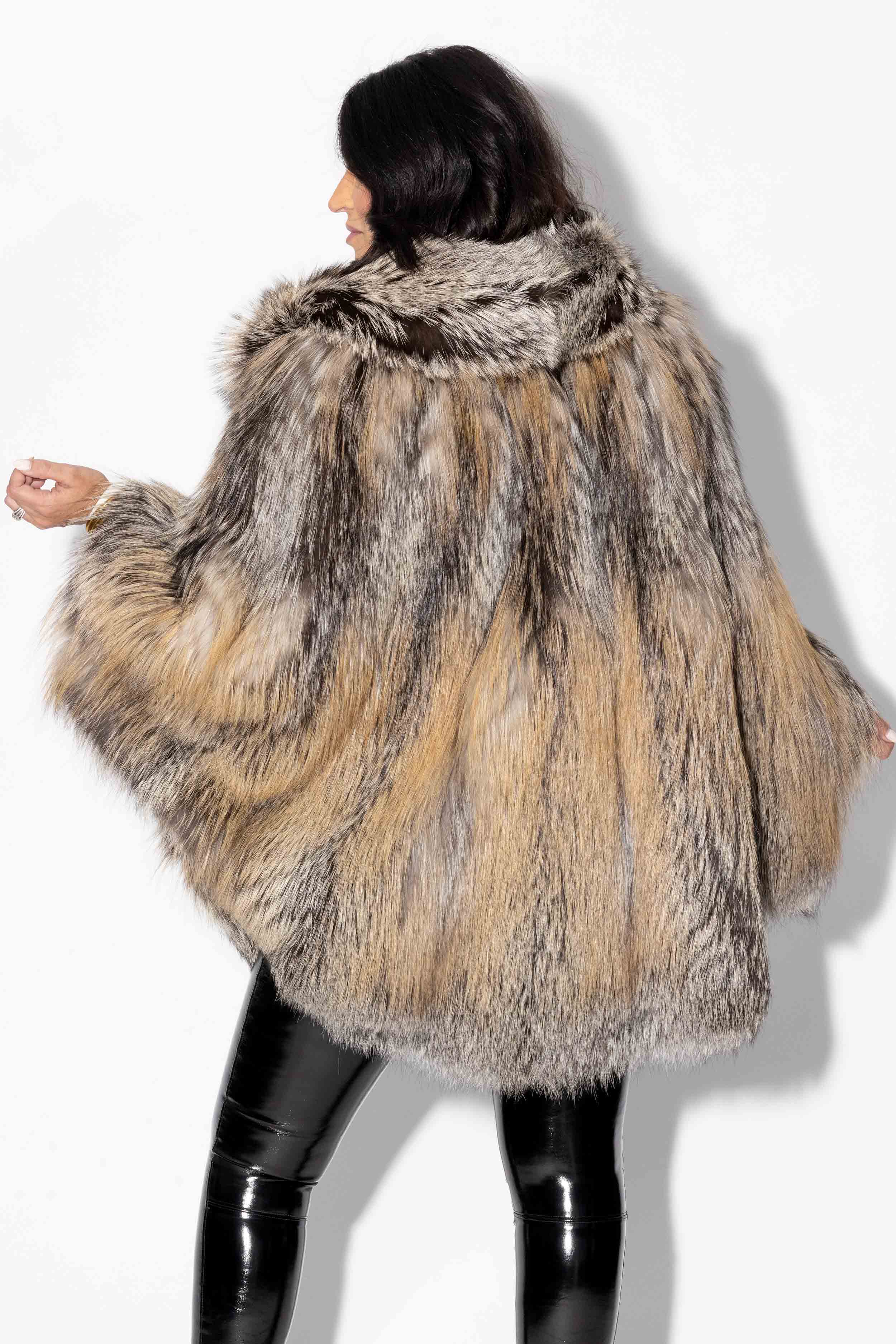 This stunning dark gray fox fur cape comes with a luxurious full fur hood and a leather belt to accentuate your waist. Fully lined for comfort, it includes hook & eye snap closures and convenient side pockets. Unique and exclusive, this piece won't last long—secure yours today!
