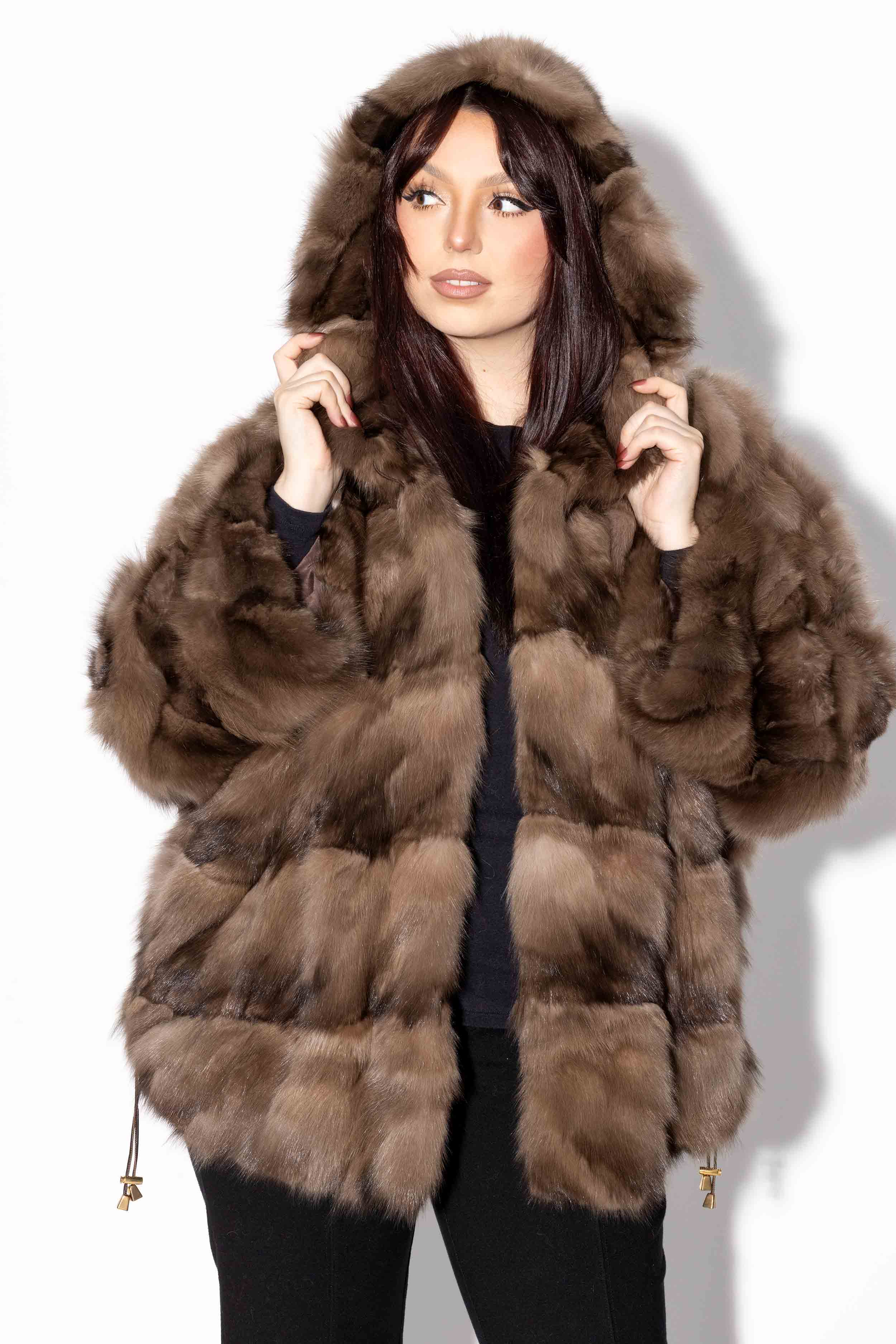 This reversible sectioned sable fur cape is features a hood, and an adjustable waist. Fully lined and equipped with side pockets, it closes securely with hook and eye snaps. Elevate your winter style with this unique, versatile fur sable cape today! One size fits most.