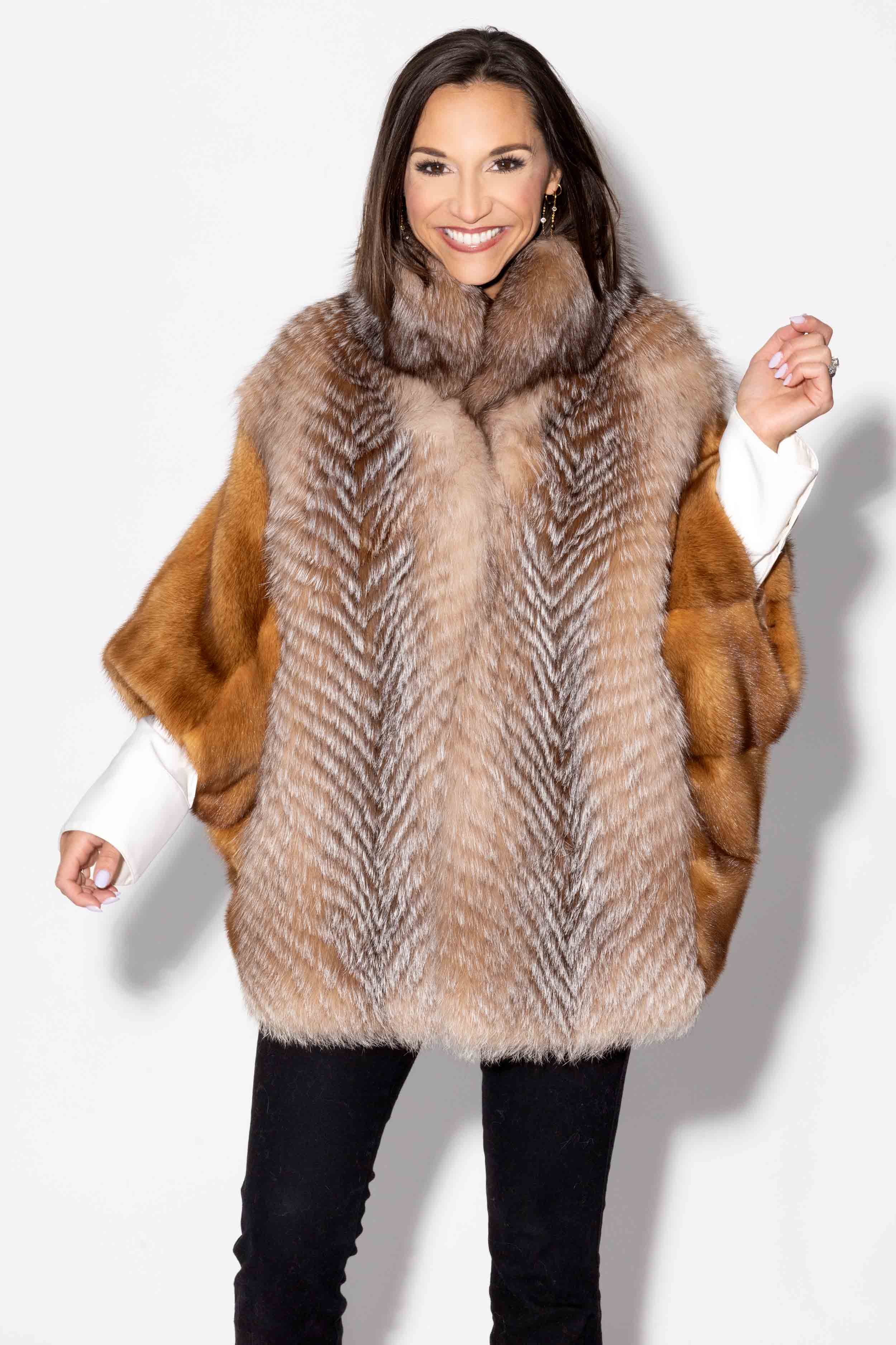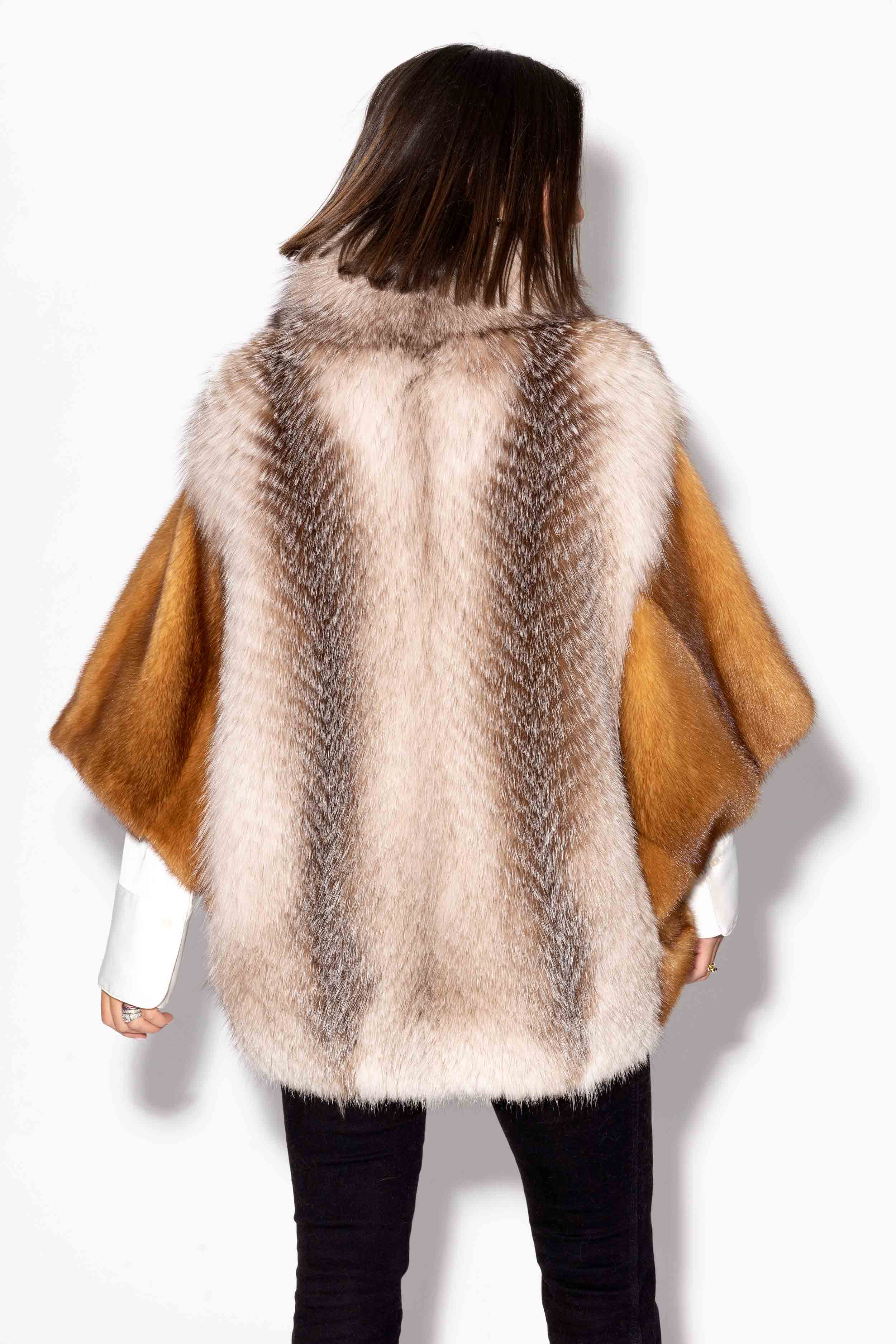 This gorgeous mink fur cape features cropped mink fur sleeves and luxurious fox fur on the front, back and collar. It has pockets and is fully lined. One size fits most (XS-XL).