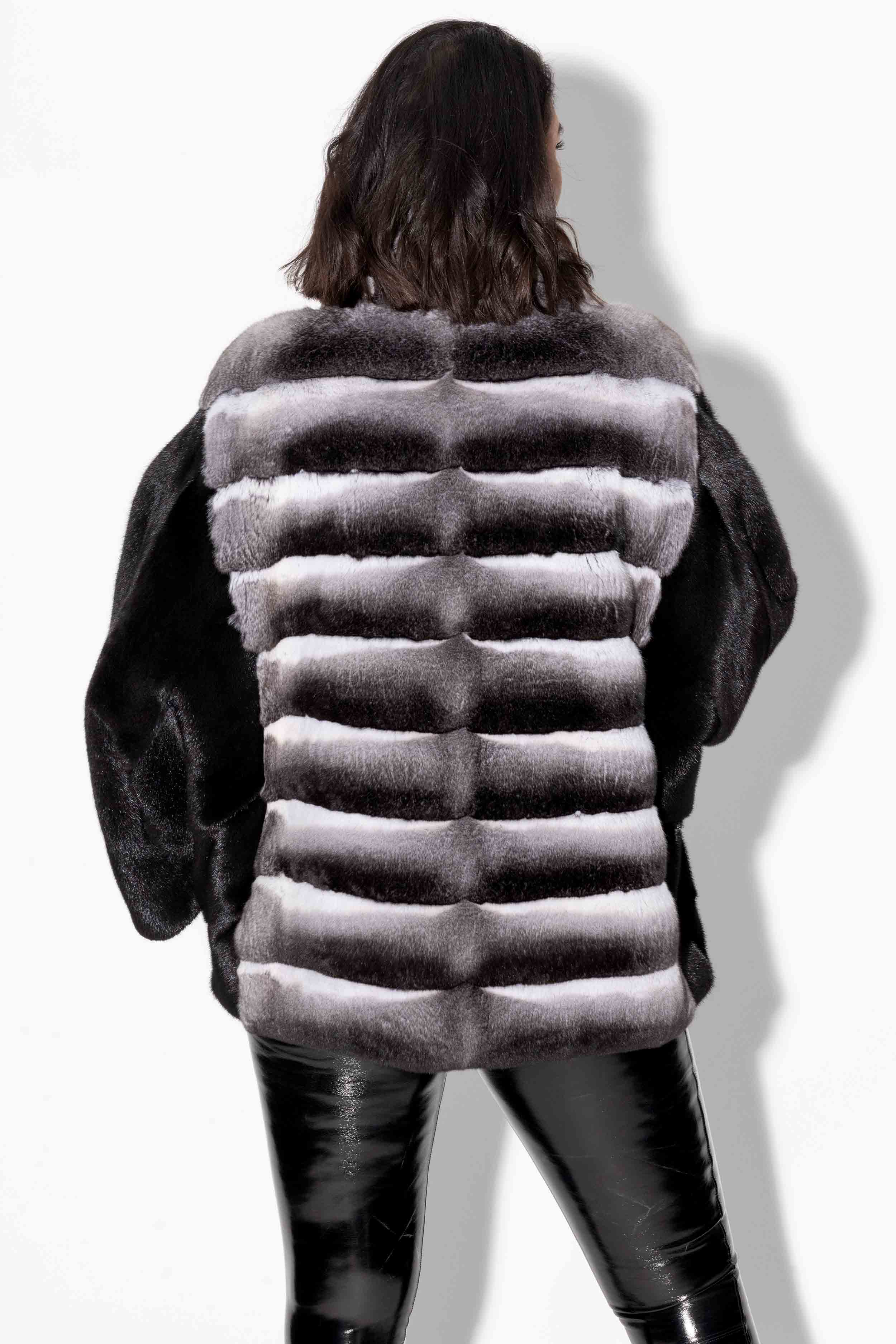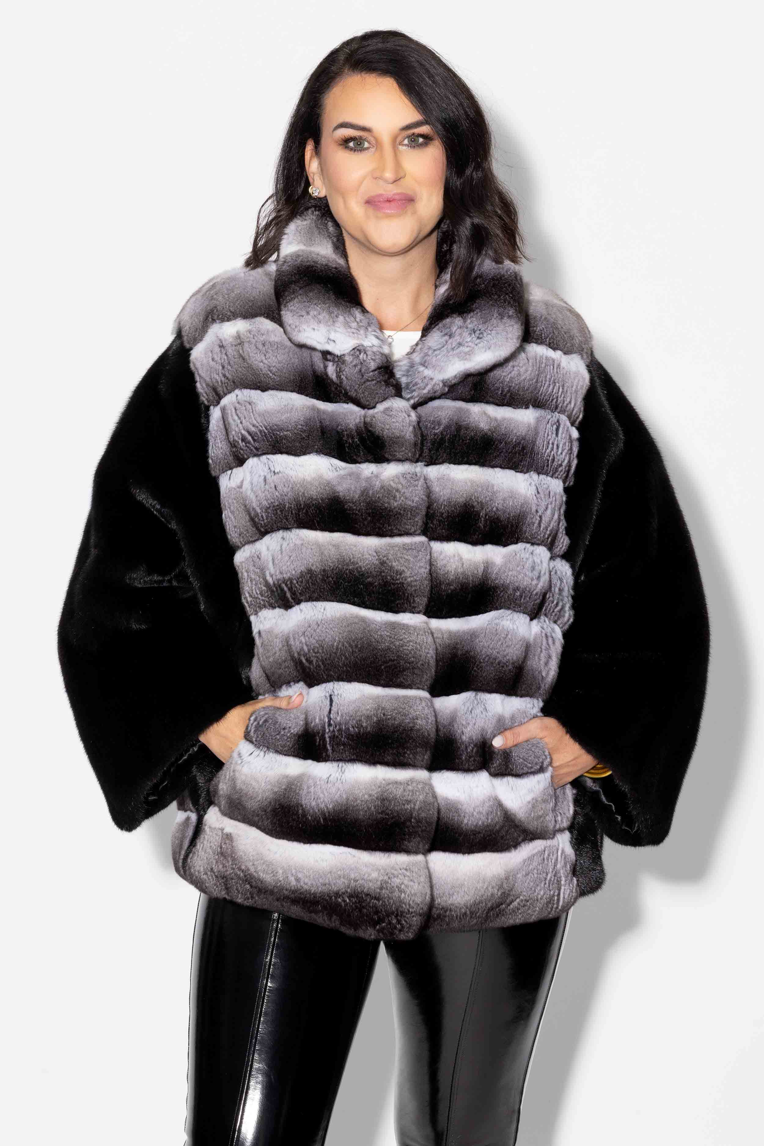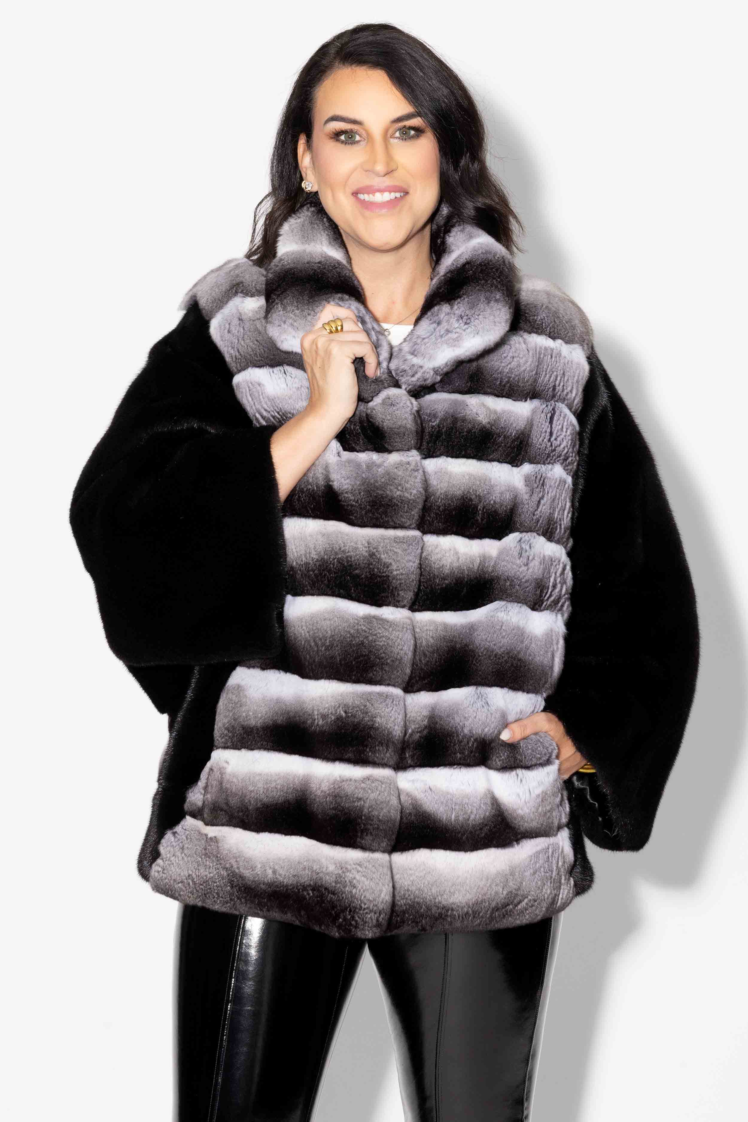 This stunning blackglama mink fur jacket blended with chinchilla fur is designed to impress. Fully lined for comfort, it includes convenient hook & eye snap closures and practical pockets, making it as functional as it is elegant.
