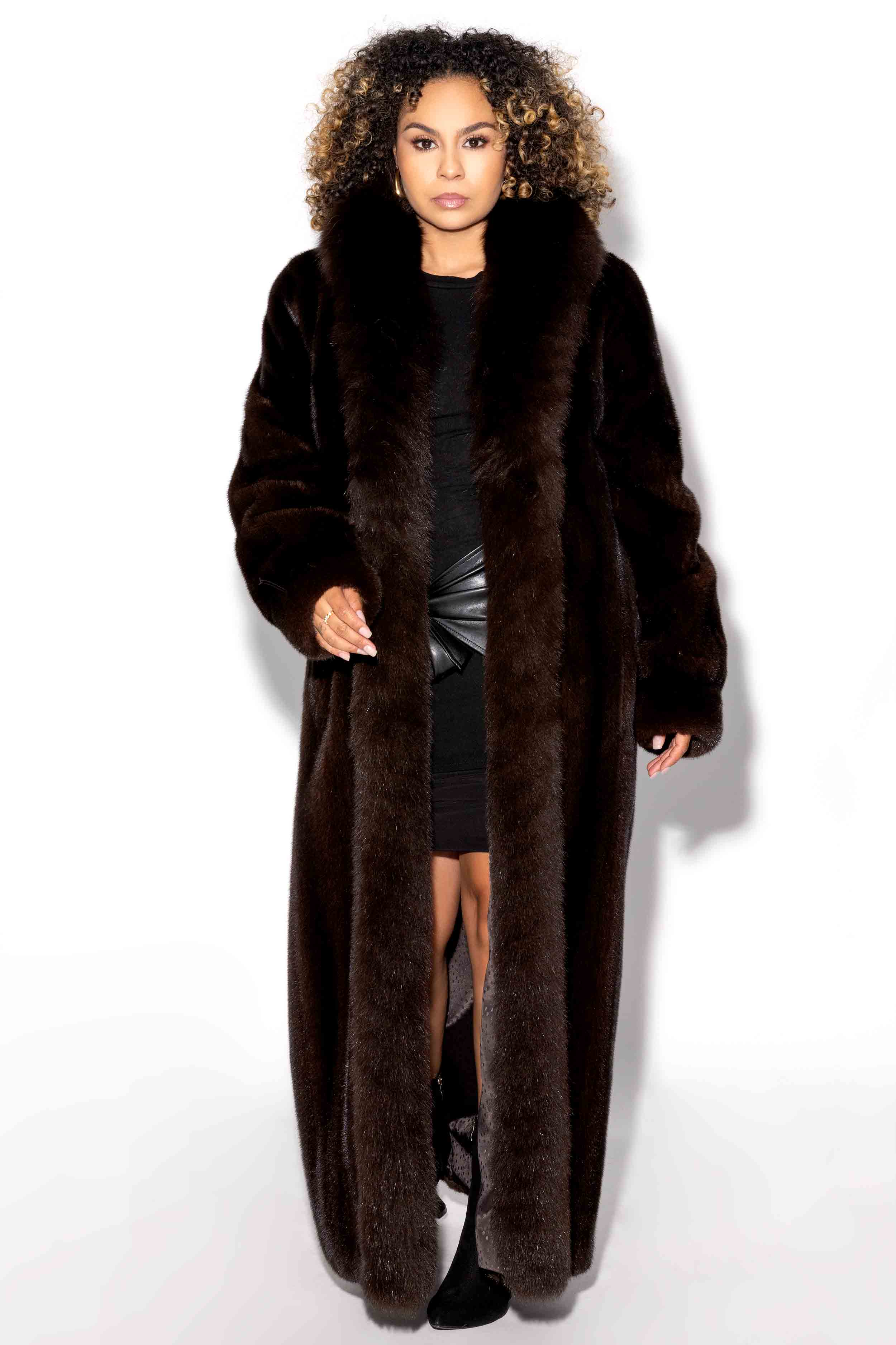 This luxurious female mink fur full length coat accentuated with a rich fox fur tux is truly a must have fur. Enjoy the subtle contrast of the gleam of rich fox fur against the velvety sheen of this elegant mink fur coat. This coat has hook & eye closures, side pockets & is fully lined.