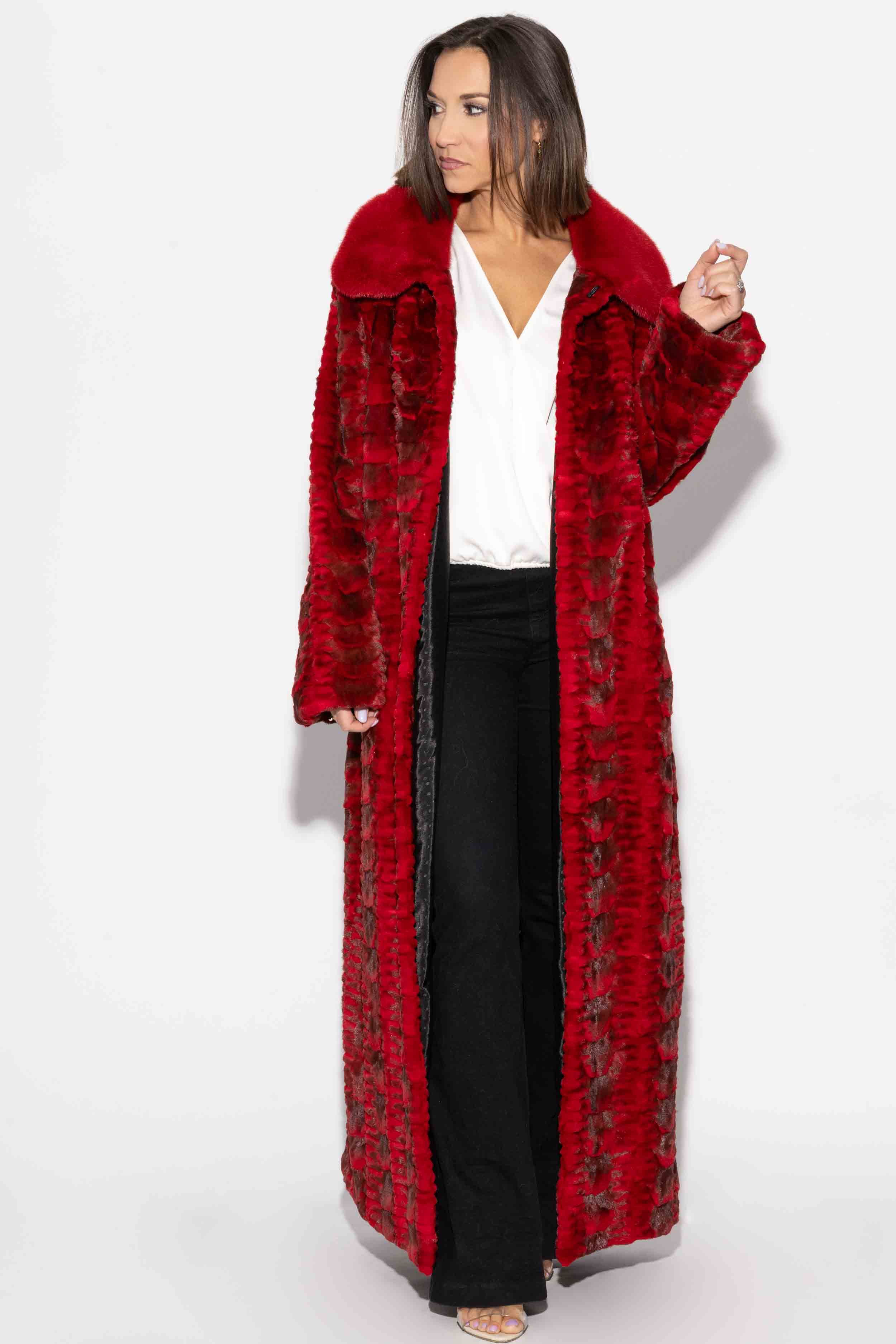 Turn heads in this fashionable sheared sectioned full length mink fur coat that has been handcrafted in a sculpted pattern creating a trendy and unique style. It's accentuated with a full mink fur collar, hook & eye snap closure front, and side entry pockets. It's fully lined. Available in a variety of colors, you are sure to find one you love!