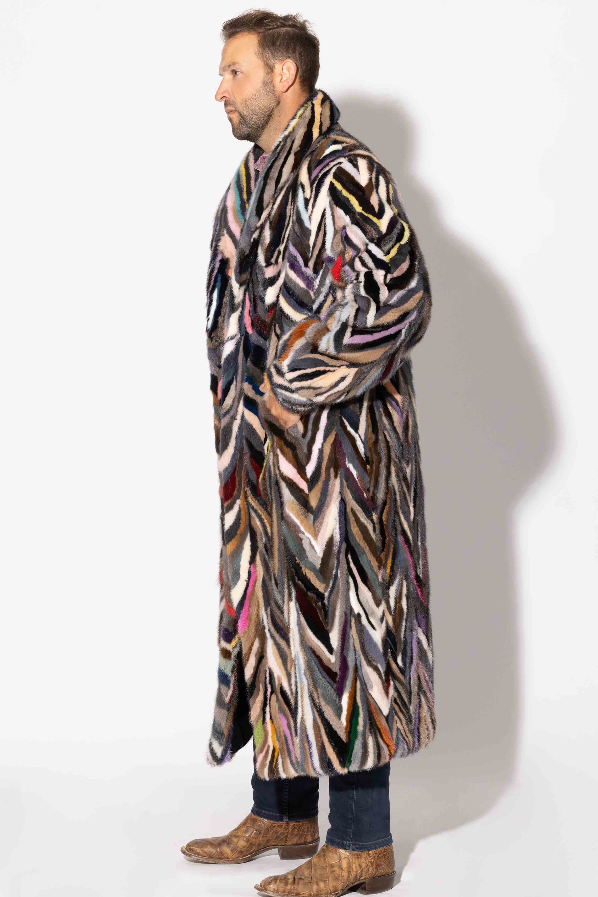 This full length sectioned mink fur coat is masculine, elegant, and warm! It's the perfect fur coat for any man searching for the best coat that's versatile enough to wear with slacks or jeans, or over your best tux! It has been handcrafted in a sculptured pattern and accentuated with a shawl collar. It is fully lined, and features side pockets and hook & eye snap closures. It has been dyed in your choice of ranch, brown or multicolor.