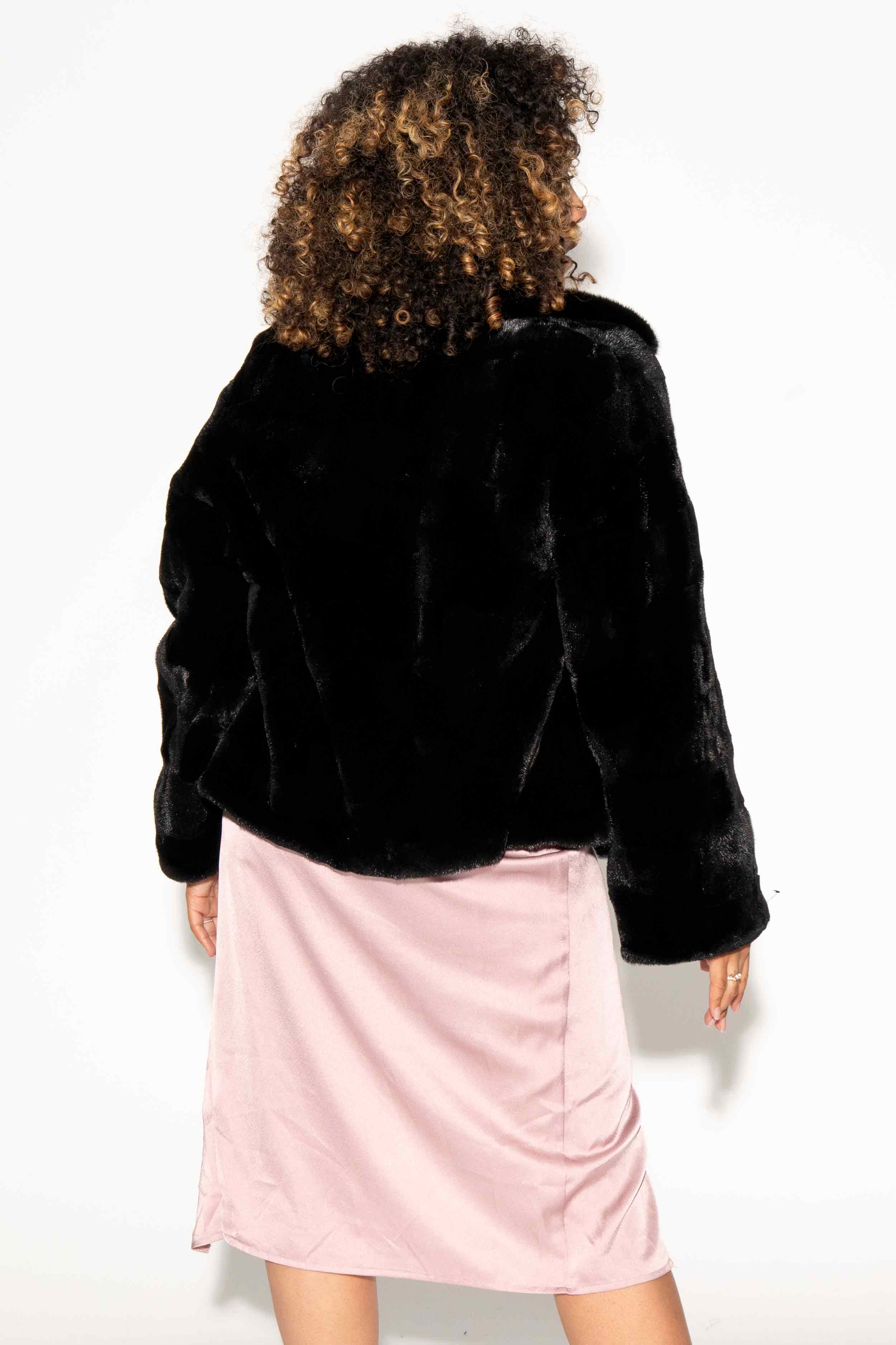 This stylish jacket, made from luxurious black velvet sheared mink fur, features a timeless notch collar and streamlined straight sleeves. Designed with convenient side pockets and fully lined for added comfort, it closes effortlessly with hook and eye snap fastenings, blending sophistication with practicality.